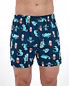 Чоловічі боксери Cornette у темно-синьому кольорі — класична вільна модель із 100% м’якої бавовни. Полотно доповнене оригінальним принтом із динозаврами. У поясі — широка резинка, що забезпечує зручну посадку по фігурі.