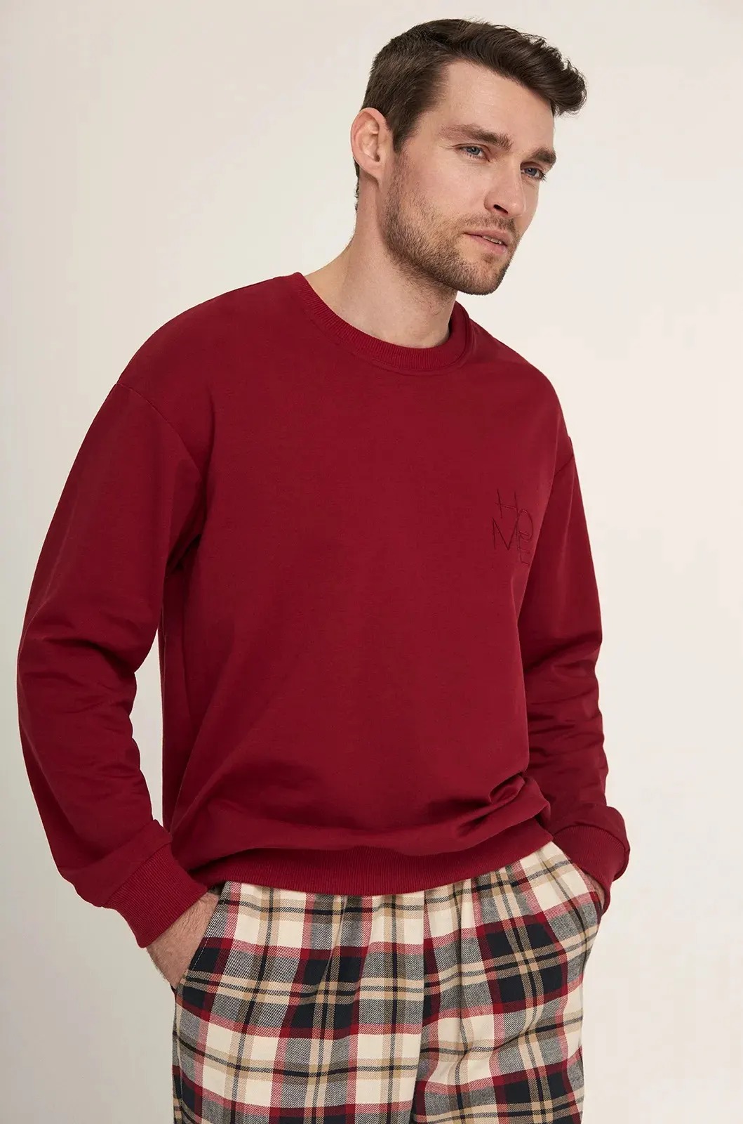 Штани прямого крою оснащені кишенями та поясом на резинці з функціональним шнурком, що дозволяє комфортно регулювати посадку. Щільна, проте м’яка двонитка приємна до тіла, добре пропускає повітря та забезпечує свободу рухів завдяки еластичності. Насичений бордовий колір підкреслює стильність комплекту. Ідеальний варіант для подарунку до свят.