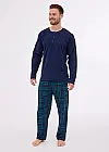 Чоловіча піжама Owen — класична модель від польського бренду Cornette. Піжама виготовлена з якісної та м’якої бавовни темно-синього кольору. Комплект складається з однотонної кофти та штанів у зелену клітинку.