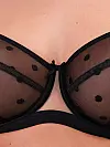 Модель із м’якою чашкою на каркасах виконана в елегантному поєднанні чорного та нюдового кольорів, а делікатний візерунок у горошок додає особливого шарму. Бюстгальтер формує привабливе декольте, даруючи підтримку та комфорт на цілий день. Регульовані не відстібні бретелі та класична застібка на спині забезпечують зручну посадку.