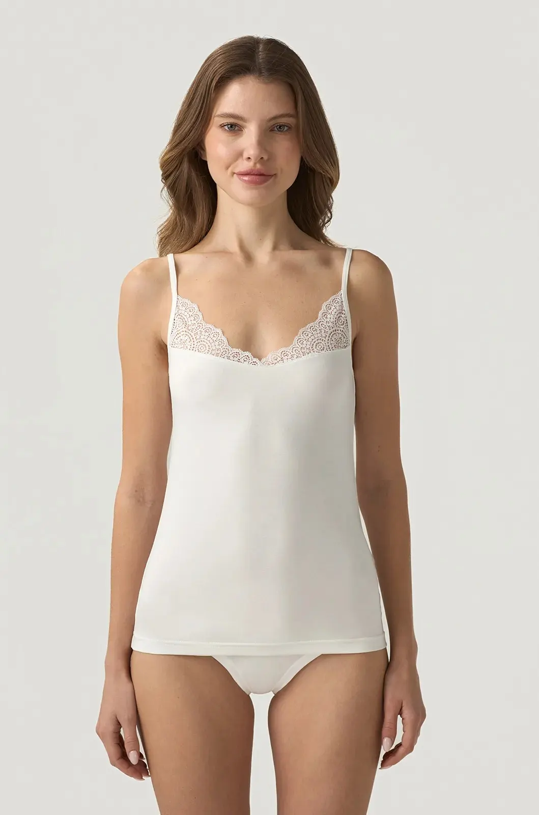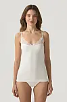 Модель у молочному кольорі має тонкі бретелі та прикрашена делікатним мереживом, що додає жіночності навіть у повсякденному образі. М’яке модальне полотно приємне до тіла та добре тягнеться, забезпечуючи комфорт на кожен день.
