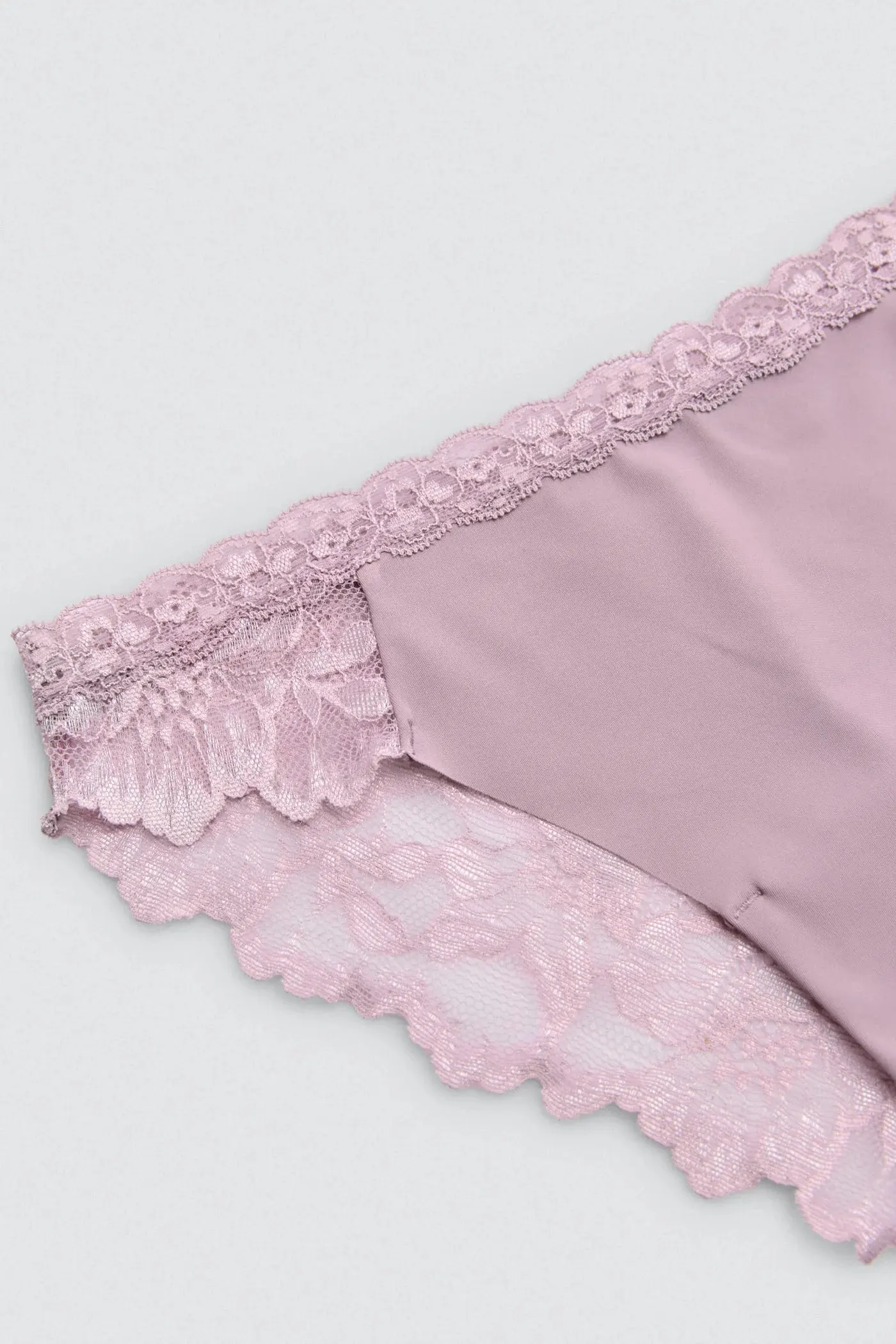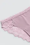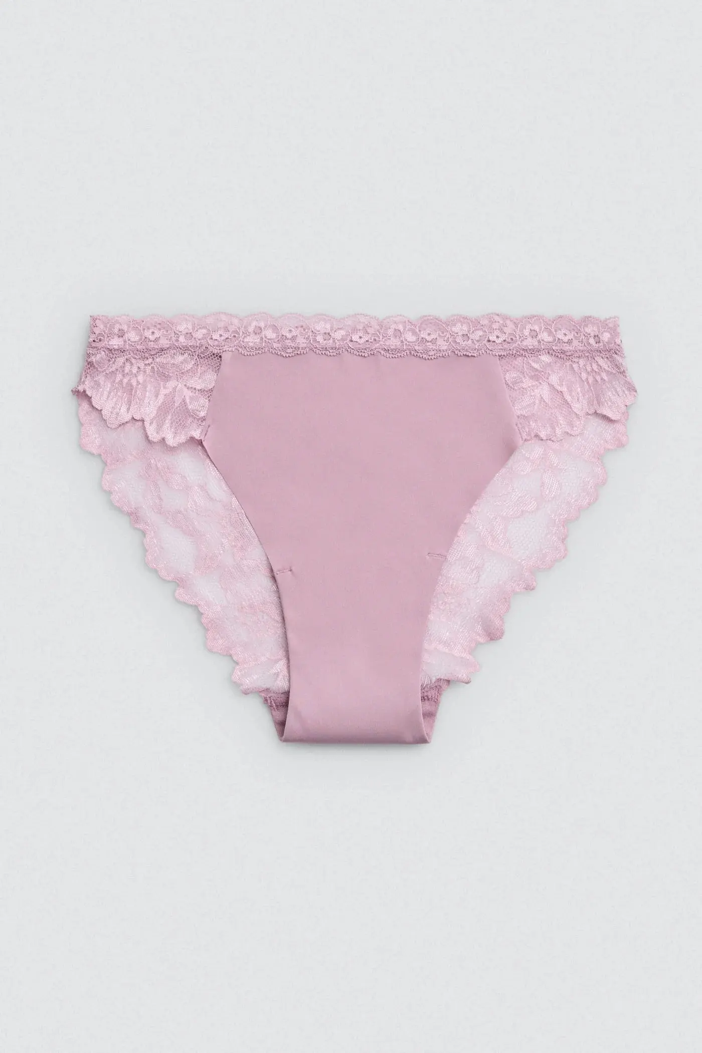 Лазерна обробка країв забезпечує гладкий силует і непомітність під одягом, а ніжне мереживо з боків і на спинці додає вишуканості. Бразильський крій підкреслює форми, забезпечуючи зручну посадку без заломів завдяки еластичній тканині.