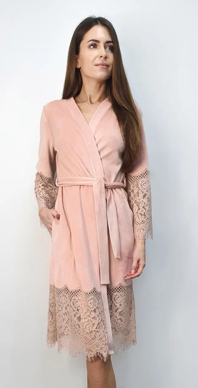 Розкішний халат від українського бренду Shato — це поєднання елегантності, комфорту та витонченого стилю. Модель пудрового кольору виготовлена з м’якого приємного до тіла велюру, має довгі розширені рукави та пояс на запах. Широкі мереживні вставки на рукавах і по низу додають вишуканості, перетворюючи цей халат у справжню прикрасу вашого домашнього гардеробу.