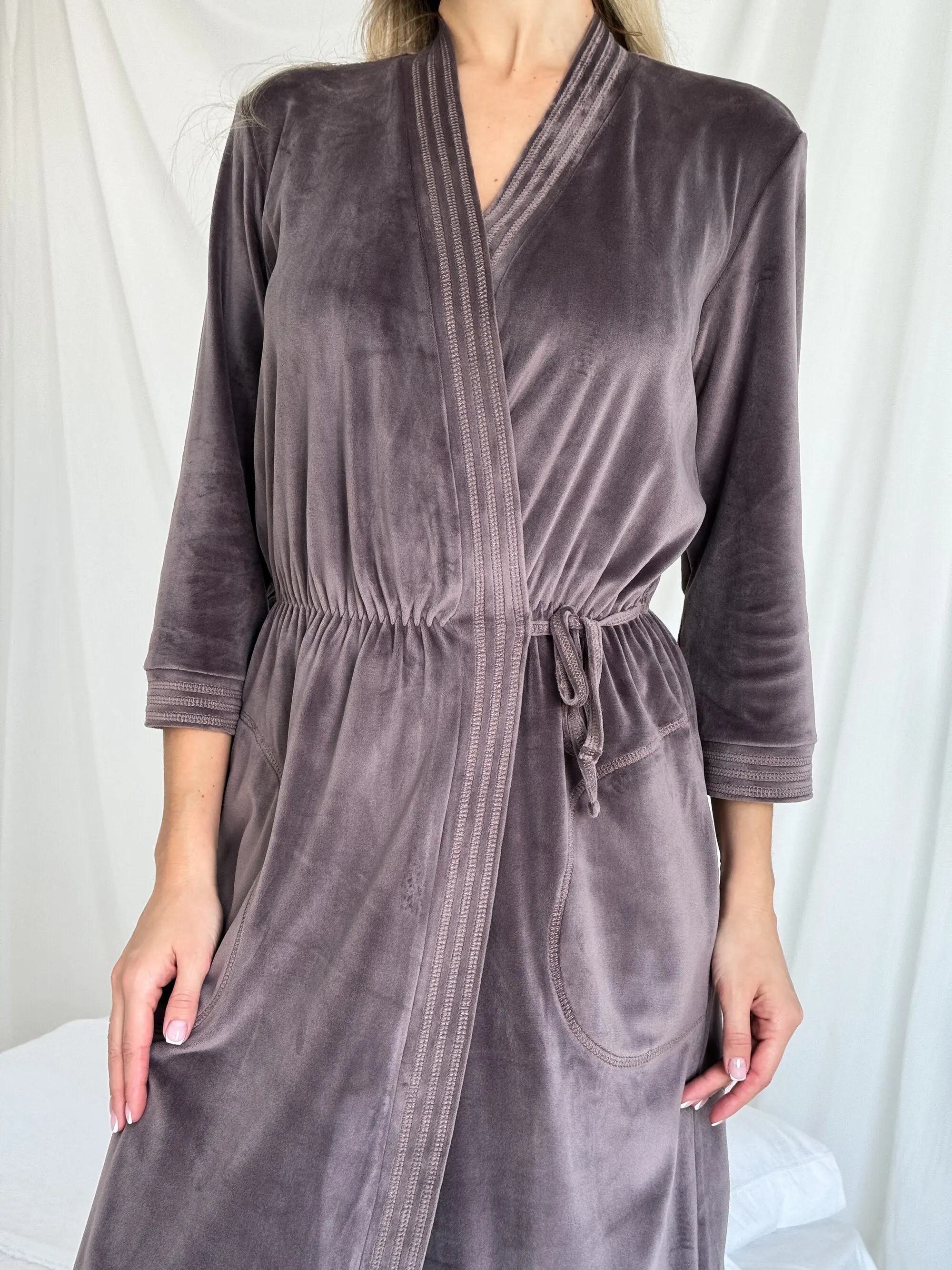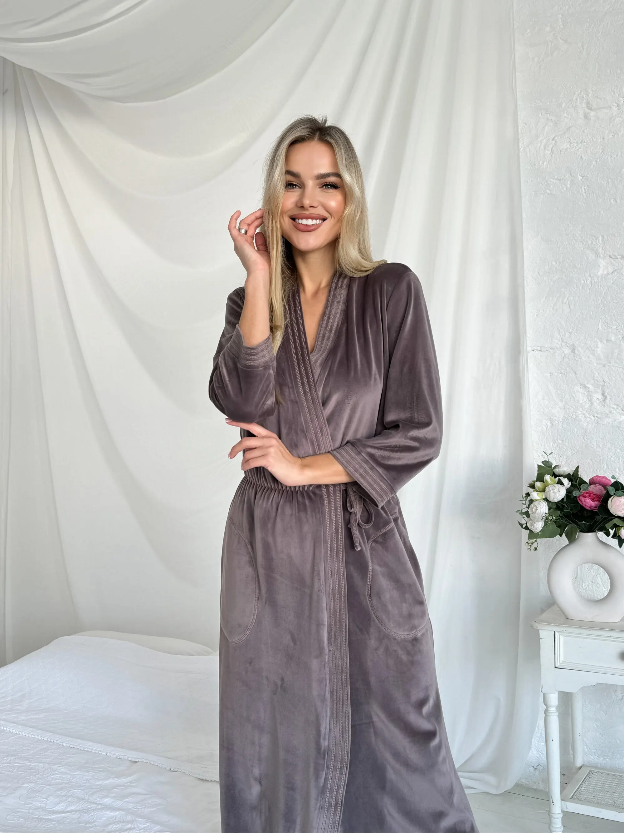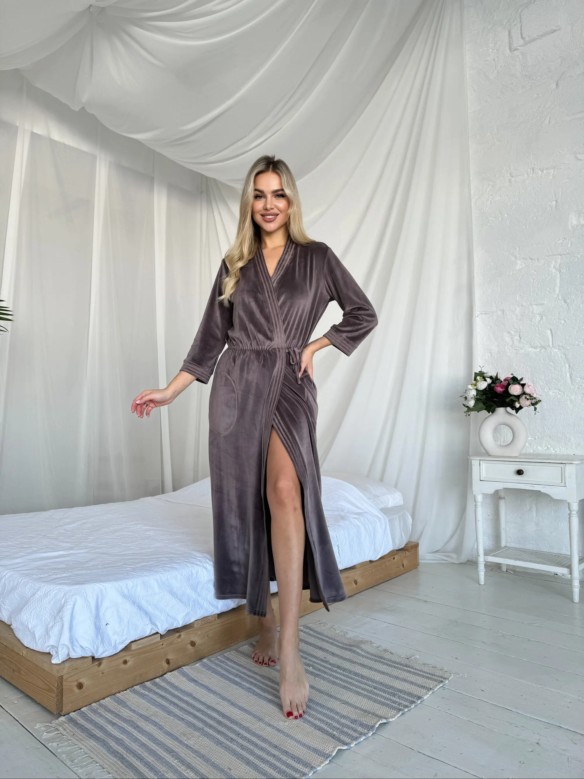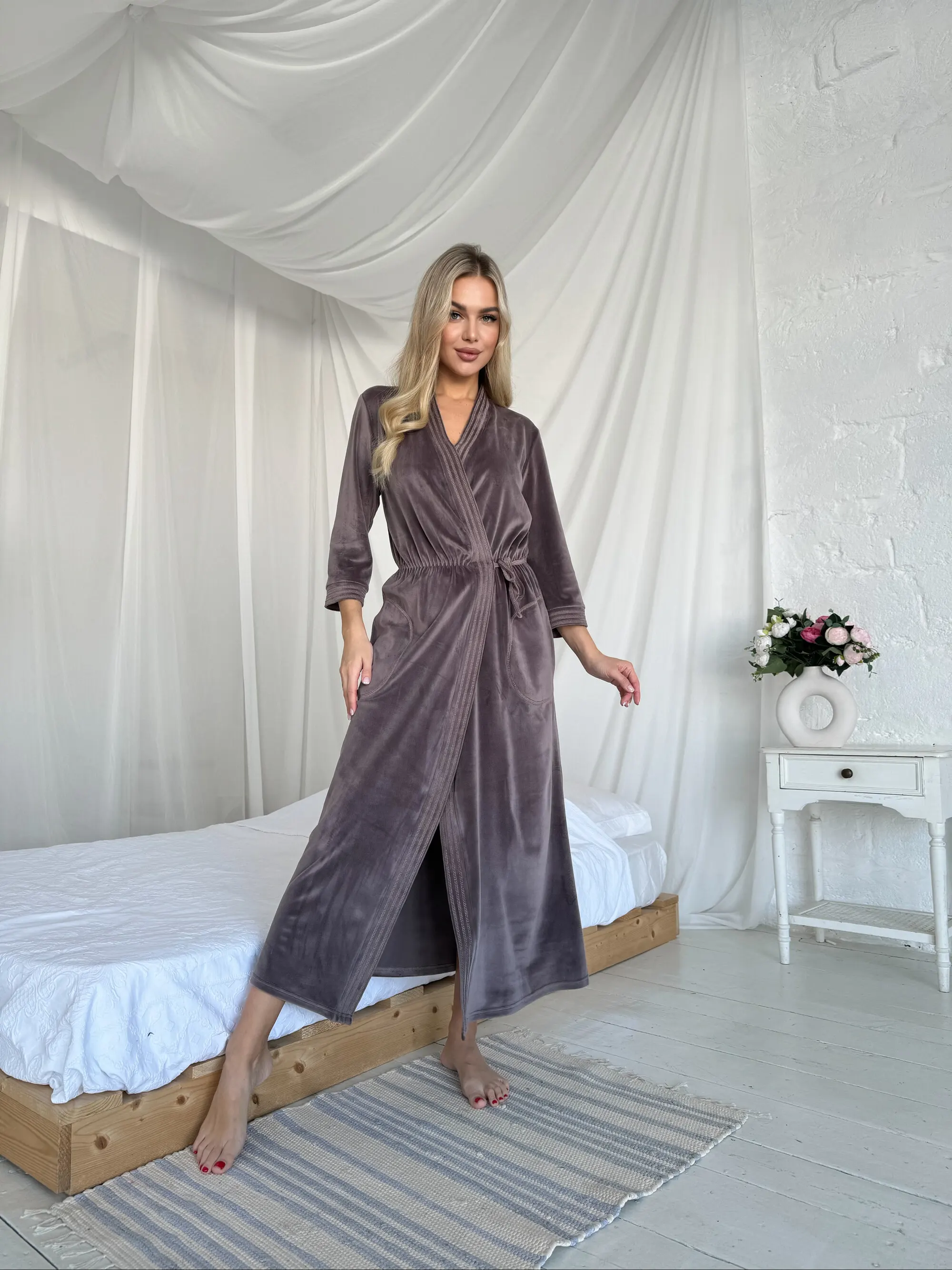 Довгий халат від українського бренду Julia — це ідеальний вибір для домашнього затишку та комфорту. Виконаний із м’якого велюру кольору мокко з ефектом "плюшу", халат має рукав ¾, внутрішні кишені з боків і фіксується на запах завдяки внутрішнім та зовнішнім зав’язкам. М’яка резинка на талії забезпечує комфортну посадку, а приємна на дотик тканина дарує відчуття тепла та ніжності.