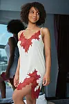 Сорочка має тонкі регульовані бретелі, глибокий V-подібний виріз і високий розріз на стегні, оздоблені делікатним мереживом шантильї з квітковим мотивом. Кожен елемент мережива вирізано та вшито вручну, що надає виробу унікального шарму та майстерності.