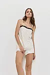 Колір — світло-бежевий у дрібний чорний горошок з чорним мереживним акцентом.