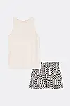 Колір — бежевий топ у поєднанні з шортами в чорно-кремовому геометричному принті.