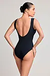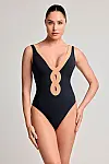 Купальник чорного кольору з дуже елегантним мінімалістичним дизайном виглядає стримано й водночас розкішно, підкреслюючи жіночність силуету.